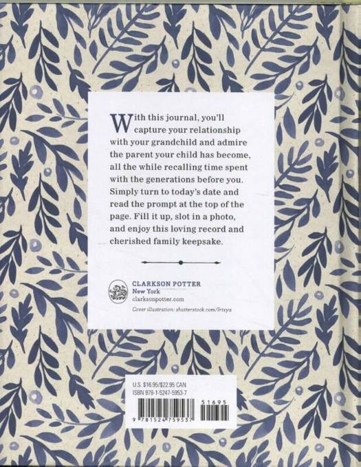 A thoughtful guided journal to nurture the special bond between grandparents and grandchildren Becoming a grandparent is one of the most exciting and rewarding life events. You have so much to teach your grandchildren--and so much to learn from them, too. This journal will help you capture that relationship, as well as admire the parent your child has become, all the while recalling time spent with generations before you. You can use it to preserve a new grandchild's first few years, or to admire how an older grandchild is changing. Simply turn to today's date and read the prompt at the top of the page. Fill it up, slot your favorite photo into the pocket on the cover, and enjoy this loving record and cherished family keepsake.