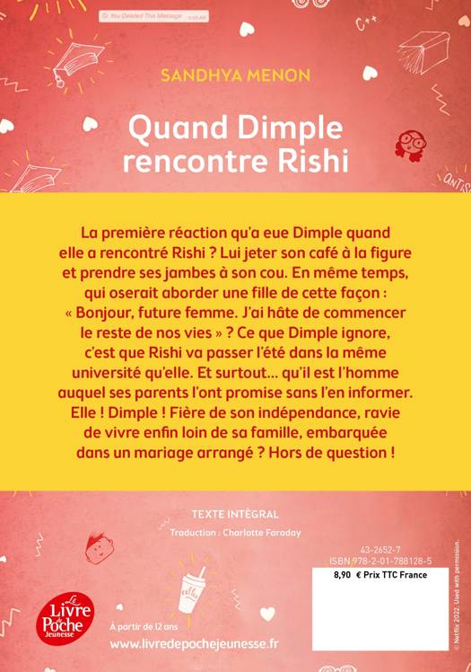 La première réaction qu’a eu Dimple quand elle a rencontré Rishi ? Lui jeter son café à a figure et prendre ses jambes à son cou. En même temps, qui oserait aborder une fille de cette façon : « Bonjour, future femme. J’ai hâte de commencer le reste de nos vies. » ? Ce que Dimple ignore, c’est que Rishi va passer l’été dans la même université qu’elle. Et surtout… qu’il est l’homme auquel ses parents l’ont promise sans l’en informer ! Elle ! Dimple ! Fière de son indépendance, ravie de vivre enfin loin de sa famille, embarquée dans un mariage arrangé ? Hors de question !