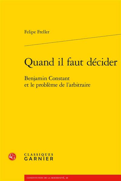 Il est commun de caractériser le libéralisme comme une doctrine ou une idéologie qui néglige, voire nie, la dimension de la décision. Or, Benjamin Constant, présenté souvent comme un « père fondateur » du libéralisme, peut être considéré comme un auteur qui remet en question cette représentation courante de la tradition libérale. En effet, en dépit de sa condamnation réitérée de l'arbitraire compris comme pouvoir illimité, sa pensée n'a pas cessé d'essayer de rendre compte des situations qui requièrent l'arbitraire compris comme décision impossible à fonder sur l'application d'un principe ou d'une loi préalable. C'est pourquoi il n'y a pas une simple condamnation, mais un véritable problème de l'arbitraire dans l'oeuvre de Constant.