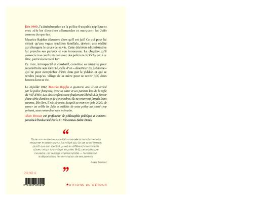 Ce livre est le récit de quatre ans de la vie d’un jeune garçon, fait Juif par l’administration à douze ans, qui devenu adulte, recherche un sens à cette assignation qui changea le cours de sa vie.