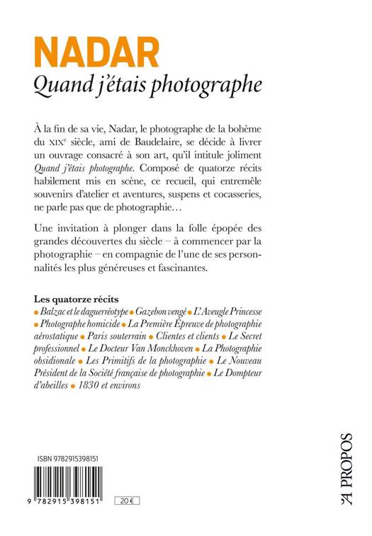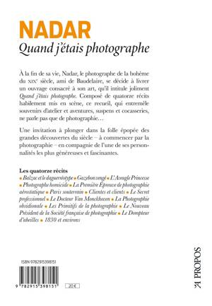 En 1900, à l'âge de quatre-vingts ans, Nadar publie Quand j'étais photographe, présenté alors comme ses mémoires. En réalité, le photographe, caricaturiste, journaliste et écrivain dans ses vies antérieures, y reprend presque exclusivement des textes précédemment parus dans la revue Paris-Photographe, dirigée par son fils Paul. Dans ces quatorze récits courts, apparemment sans lien entre eux si ce n' est un fil - parfois ténu - à la photographie, Nadar nous happe dans son rythme de vie trépidant, et nous fait revivre quelques-unes de ses aventures : les premières photographies dans les catacombes ou dans les égouts, la première photographie depuis les airs, dont il a réellement été l'inventeur, son voyage en ballon jusqu'en Prusse, ou encore l'utilisation de la photographie durant le Siège de Paris en 1870-1871. Il nous livre également de truculents portraits de ses contemporains face à cette nouvelle pratique, considérée comme magique par certains. Un texte passionnant, mais parfois obscur, tant les références aux artistes et scientifiques de l'époque sont nombreuses et bien souvent elliptiques. Un commentaire s'imposait pour permettre au lecteur de goûter pleinement la saveur d'un ouvrage étonnant, à l'image de son auteur.