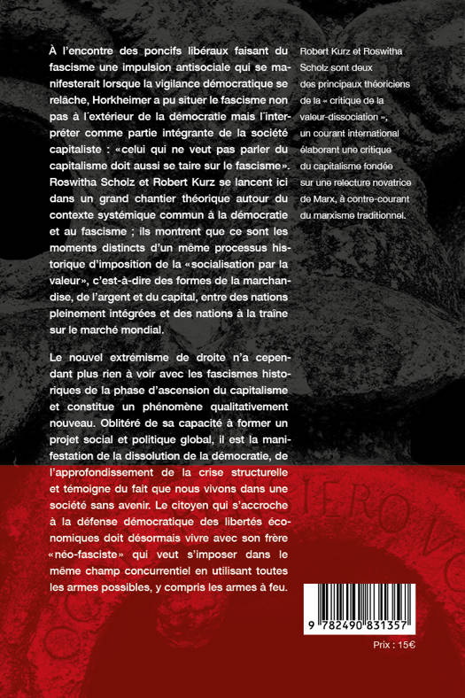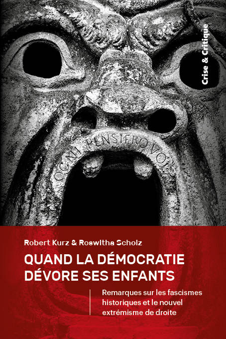 Roswitha Scholz et Robert Kurz se lancent ici dans un grand chantier théorique autour du contexte systémique commun à la démocratie et au fascisme , ils montrent que ce sont les moments distincts d'un même processus historique d'imposition de la « socialisation par la valeur », c'est-à-dire des formes de la marchandise, de l'argent et du capital, entre des nations pleinement intégrées et des nations à la traîne sur le marché mondial. Le nouvel extrémisme de droite n'a cependant plus rien à voir avec les fascismes historiques de la phase d'ascension du capitalisme et constitue un phénomène qualitativement nouveau. Oblitéré de sa capacité à former un projet social et politique global, il est la manifestation de la dissolution de la démocratie, de l'approfondissement de la crise structurelle et témoigne du fait que nous vivons dans une société sans avenir.