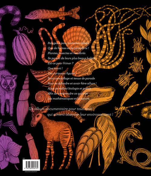 Plantes et animaux se parent de figures géométriques. Simple effet de mode ? Bien au contraire ! Ces figures apportent à l'animal ou à la plante de nombreux avantages : camouflage, aérodynamisme ou tenue de parade... Ces uniformes sont le résultat d'une longue sélection naturelle et de contraintes physiques. Mêlant habilement biologie et poésie, texte et illustrations dialoguent pour révéler ce fascinant pacte entre la nature et les mathématiques.