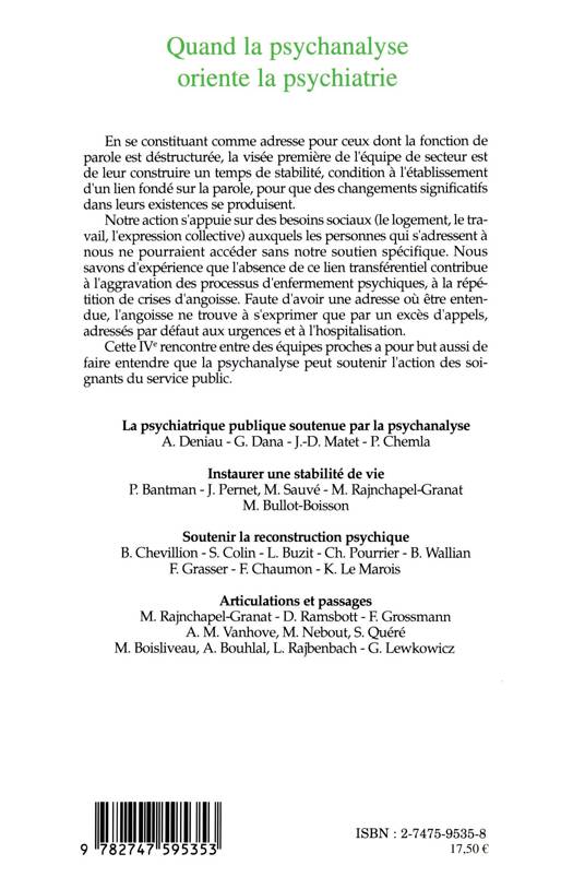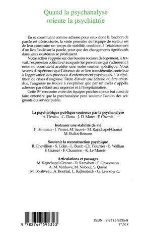 Cette réflexion entre des équipes proches a pour but de faire entendre que la psychanalyse peut soutenir l'action des soignants du service public. En se constituant comme adresse pour ceux dont la fonction de parole est déstructurée, la visée première de l'équipe de secteur est de leur construire un temps de stabilité, condition à l'établissement d'un lieu fondé sur la parole, pour que des changements significatifs dans leurs existences se produisent.