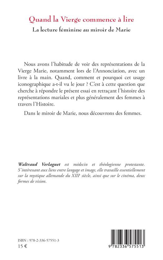 Nous avons l'habitude de voir des représentations de la Vierge Marie, notamment lors de l'Annonciation, avec un livre à la main. Quand, comment et pourquoi cet usage iconographique a-t-il vu le jour ? C'est à cette question que cherche à répondre le présent essai en retraçant l'histoire des représentations mariales et plus généralement des femmes à travers l'Histoire. Dans le miroir de Marie, nous découvrons des femmes.