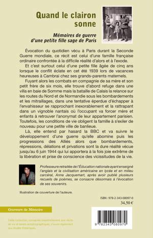 « C'est la guerre. Ma vie tranquille de petite Parisienne heureuse et sans souci vient de basculer ». Évocation du quotidien d'une petite fille à Paris sous l'occupation, des routes de l'exode jusqu'aux bruits lointains des combats de la libération, Quand le clairon sonne est le récit poignant de la vie d'une famille française ordinaire confrontée à la difficile réalité de la guerre.