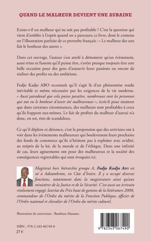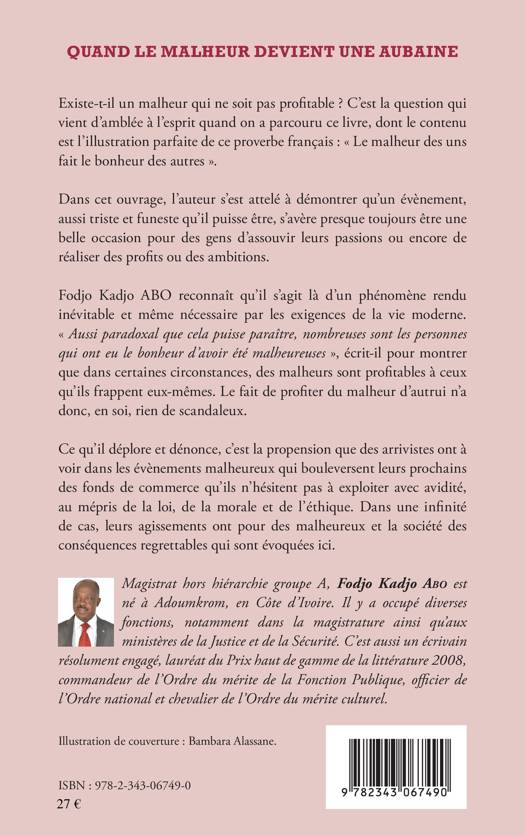 Existe-t-il un malheur qui ne soit pas profitable ? C'est la question qui vient d'emblée à l'esprit quand on a parcouru ce livre, dont le contenu est l'illustration parfaite de ce proverbe français : "Le malheur des uns fait le bonheur des autres." Dans cet ouvrage, l'auteur s'est attelé à démontrer qu'un évènement, aussi triste et funeste qu'il puisse être, s'avère toujours être une belle occasion pour des gens d'assouvir leurs passions ou encore de réaliser des profits ou des ambitions.