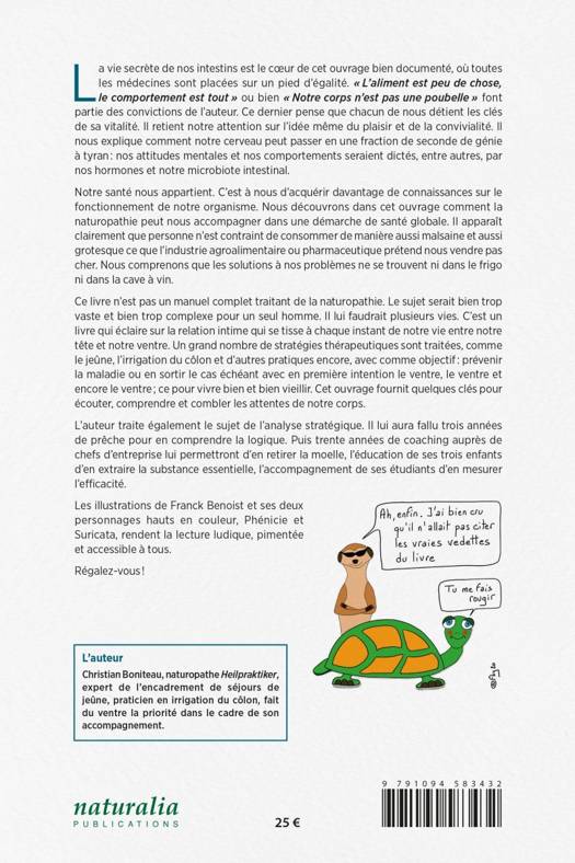Ce livre n'est pas un manuel complet traitant de la naturopathie. Le sujet serait bien trop vaste et bien trop complexe pour un seul homme. Il lui faudrait plusieurs vies. C'est un livre qui éclaire sur la relation intime qui se tisse à chaque instant de notre vie entre notre tête et notre ventre. Un grand nombre de stratégies thérapeutiques sont traitées, comme le jeûne, l'irrigation du côlon et d'autres pratiques encore, avec comme objectif : prévenir la maladie ou en sortir le cas échéant avec en première intention le ventre, le ventre et encore le ventre ; ce pour vivre bien et bien vieillir. Cet ouvrage fournit quelques clés pour écouter, comprendre et combler les attentes de notre corps. L'auteur traite également le sujet de l'analyse stratégique. Il lui aura fallu trois années de prêche pour en comprendre la logique. Puis trente années de coaching auprès de chefs d'entreprise lui permettront d'en retirer la moelle, l'éducation de ses trois enfants d'en extraire la substance essentielle, l'accompagnement de ses étudiants d'en mesurer l'efficacité. Les illustrations de Franck Benoist et ses deux personnages hauts en couleur, Phénicie et Suricata, rendent la lecture ludique, pimentée et accessible à tous. Régalez-vous !