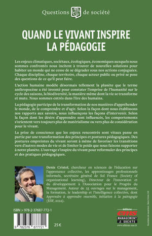 La prise de conscience que les enjeux rencontrés sont vitaux passe en partie par une transformation des principes et postures pédagogiques. Des postures empreintes du vivant seront à même de favoriser les transitions vers d’autres modes de vie et de limiter le poids que nous faisons supporter à notre planète. L’ouvrage s’inspire du vivant pour reformuler des principes et des pratiques pédagogiques.
