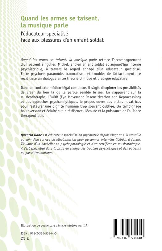 Quand les armes se taisent, la musique parle retrace l'accompagnement d'un patient singulier, Michel, ancien enfant soldat et aujourd'hui interné psychiatrique, à travers le regard engagé d'un éducateur spécialisé. Entre psychose paranoïde, traumatisme et troubles de l'attachement, ce récit tisse un dialogue entre théorie clinique et pratique éducative. Dans un contexte médico-légal complexe, il s'agit d'explorer les possibilités de créer du lien là où la parole semble brisée. En s'appuyant sur la musicothérapie, l'EMDR (Eye Movement Desensitization and Reprocessing) et des approches psychanalytiques, le propos ouvre des pistes novatrices pour restaurer une dignité humaine trop souvent oubliée. Un témoignage bouleversant et éclairé sur la résilience, l'écoute et la puissance de l'alliance thérapeutique.