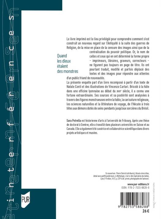 Le livre imprimé est le lieu privilégié pour comprendre comment s’est construit un nouveau regard sur l’Antiquité à la suite des guerres de Religion, de la mise en place de la censure des images ainsi que de la centralisation du pouvoir politique. Or, le nom de celles et ceux qui en ont déterminé la forme propre – imprimeurs, libraires, graveurs, correcteurs – ne figurent pas toujours en page de titre. Ils ont pourtant traduit, modifié et parfois déplacé des textes et des images pour répondre aux attentes d’un public friand de nouveautés. La présente enquête part d’un livre recomposé à partir d’un texte de Natale Conti et des illustrations de Vincenzo Cartari. Bricolé à la hâte dans une officine lyonnaise au début du XVIIe siècle, il a connu une fortune extraordinaire. Ses sources et sa postérité sont analysées à travers des figures monstrueuses entre la fable, la caricature religieuse, les sciences naturelles et la littérature de voyage, de l’Hécate à trois têtes aux démons dotés de seins pendants jusqu’aux sorcières du Brésil.