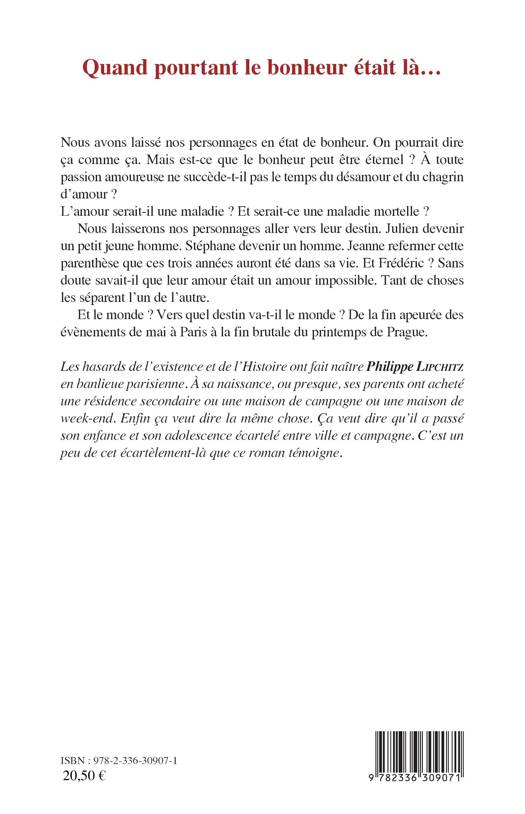 Nous avons laissé nos personnages en état de bonheur. Mais le bonheur peut-il être éternel ? A toute passion amoureuse ne succède-t-il pas le temps du désamour et du chagrin d'amour ? Nous laisserons nos personnages aller vers leur destin. Julien devenir un petit jeune homme. Stéphane devenir un homme. Jeanne refermer cette parenthèse que ces trois années auront été dans sa vie. Et Frédéric ? Sans doute savait-il que leur amour était impossible. Tant de choses les séparent l'un de l'autre.