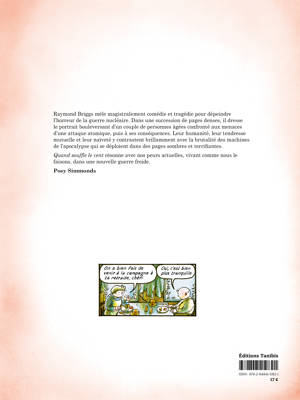 Raymond Briggs, auteur britannique jusque-là connu pour ses albums jeunesse, fait paraître en 1982 cette évocation de l’apocalypse nucléaire mêlant tragédie et comédie. Charge féroce contre des États prêts à mettre en jeu la vie de toute une population pour gagner une confrontation internationale, Quand souffle le vent est toujours terriblement d’actualité. C’est également un récit intimiste d’une grande force émotionnelle. S’inspirant de ses propres parents, Briggs campe non sans une certaine causticité un couple de personnages aussi attachants que naïfs, mais toujours animés d’une force de vie qui les pousse à croire au meilleur, jusqu’à l’aveuglement.
