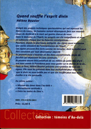 Malgré des progrès techniques spectaculaires qui ont repoussé les limites du connu, les humains restent désemparés face aux mauvais coups du destin et à la mort qui guette chacun de nous. Dans le domaine de l’esprit, les progrès ont été insignifiants et nous en subissons chaque jour les funestes conséquences. Pourtant, depuis la plus Haute Antiquité, des signes aussi nombreux que variés attestent de l’omniprésence de l’Esprit. Dans ce livre, Hélène Bouvier présente une synthèse de tous ces signes. Elle nous les présente dans leur multiplicité pour nous dire que le divin ne nous oublie pas et que son souffle peut tous nous éveiller à la Vie spirituelle. Ces signes peuvent être forts comme les miracles, dont la réalité peut être constatée par tout observateur objectif. Ils peuvent aussi s’incarner en des êtres exceptionnels, doués de facultés qui dépassent les sens communs. Ils peuvent encore être constitués de ces milliers de petits clins d’œil que nous envoie la Providence pour nous guider sur le chemin de la vie…