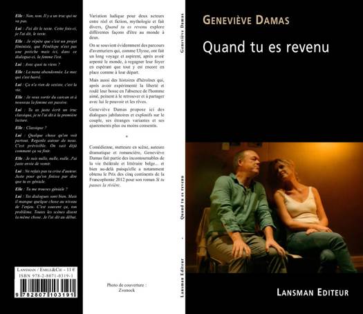 Variation ludique pour deux acteurs entre réel et fiction, mythologie et fait divers, Quand tu es revenu explore différentes façons d'être au monde à deux. On se souvient évidemment des parcours d'aventuriers qui, comme Ulysse, ont fait un long voyage et aspirent, après avoir arpenté le monde, à regagner leur foyer en espérant que tout y est encore en place comme à leur départ. Mais aussi des histoires d'héroïnes qui, après avoir expérimenté la liberté et roulé leur bosse en l'absence de l'homme aimé, peinent à le retrouver et à partager avec lui le pouvoir et les rêves. Geneviève Damas propose ici des dialogues jubilatoires et explosifs sur le couple, ses étranges variantes et ses ajustements plus ou moins consentis. Comédienne, metteure en scène, auteure dramatique et romancière, Geneviève Damas fait partie des incontournables de la vie théâtrale et littéraire belge... Et bien au-delà puisqu'elle a notamment obtenu le Prix des cinq continents de la Francophonie 2012 pour son roman Si tu passes la rivière.