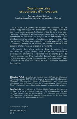 La COVID 19 a généré des expériences traduites par des effets d'apprentissage et d'innovation. L'ouvrage reproduit des recherches à propos des leçons tirées de cette crise pandémique. Le diagnostic et les enseignements qu'y sont partagés concernent les territoires, les citoyens et les entreprises. Aussi bien les questions posées que les réponses qui y sont apportées permettent d'éclairer une nouvelle normalité caractérisée par la volatilité, l'incertitude et, surtout, par la démonstration d'une capacité à la fois réactive, proactive et résiliente. Ce dernier livre, d'une série de deux, (le premier tome s'intitulant Les leçons d'une crise) expose les contributions d'enseignants-chercheurs originaires de différents pays de l'Union européenne. C'est le résultat d'un colloque scientifique organisé au Portugal par l'Universidade Europeia de Lisbonne, l'IPAM de Porto et le réseau ERECO-PGV - European Research Community.
