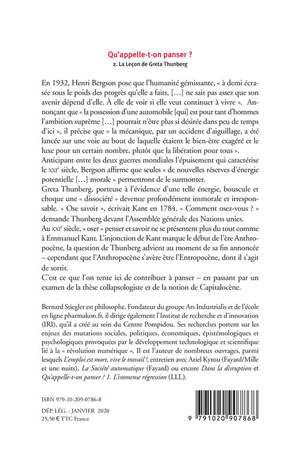 En 1932, Henri Bergson pose que l'humanité gémissante, « à demi écrasée sous le poids des progrès qu'elle a faits, [...] ne sait pas assez que son avenir dépend d'elle. À elle de voir si elle veut continuer à vivre ». Annonçant que « la possession d'une automobile [qui] est pour tant d'hommes l'ambition suprême [...] pourrait n'être plus si désirée dans peu de temps d'ici », il précise que « la mécanique, par un accident d'aiguillage, a été lancée sur une voie au bout de laquelle étaient le bien-être exagéré et le luxe pour un certain nombre, plutôt que la libération pour tous ». Anticipant entre les deux guerres mondiales l'épuisement qui caractérise le XXIe siècle, Bergson affirme que seules « de nouvelles réserves d'énergie potentielle [...] morale » permettront de le surmonter. Greta Thunberg, porteuse à l'évidence d'une telle énergie, bouscule et choque une « dissociété » devenue profondément immorale et irresponsable. « Ose savoir », écrivait Kant en 1784. « Comment osez-vous ? » demande Thunberg devant l'Assemblée générale des Nations unies. Au XXIe siècle, « oser » penser et savoir ne se présentent plus du tout comme à Emmanuel Kant. L'injonction de Kant marque le début de l'ère Anthropocène, la question de Thunberg advient au moment de sa fin annoncée - cependant que l'Anthropocène s'avère être l'Entropocène, dont il s'agit de sortir. C'est ce que l'on tente ici de contribuer à panser - en passant par un examen de la thèse collapsologiste et de la notion de Capitalocène.
