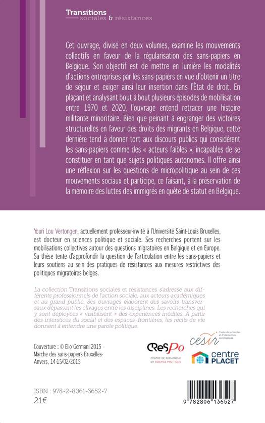 Cet ouvrage, divisé en deux volumes, examine les mouvements collectifs en faveur de la régularisation des sans-papiers en Belgique. Son objectif est de mettre en lumière les modalités d’actions entreprises par les sans-papiers en vue d’obtenir un titre de séjour et exiger ainsi leur insertion dans l’État de droit. Il offre ainsi une réflexion sur les questions de micropolitique au sein de ces mouvements sociaux et participe, ce faisant, à la préservation de la mémoire des luttes des immigrés en quête de statut en Belgique.