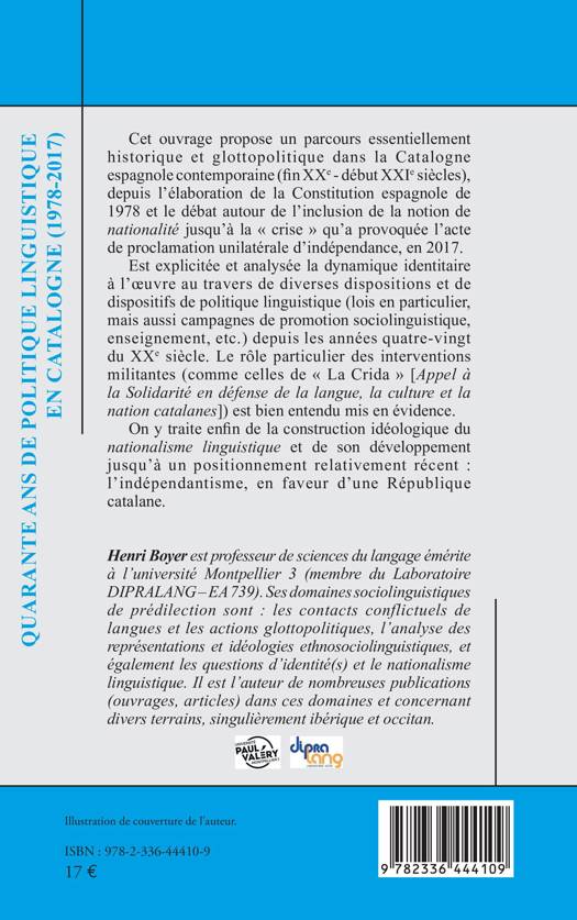 Cet ouvrage propose un parcours essentiellement historique et glottopolitique dans la Catalogne espagnole contemporaine (fin XXe- début XXIe siècles), depuis l’élaboration de la Constitution espagnole de 1978 et le débat autour de l’inclusion de la notion de nationalité jusqu’à la « crise » qu’a provoquée l’acte de proclamation unilatérale d’indépendance, en 2017. Est explicitée et analysée la dynamique identitaire à l’œuvre au travers de diverses dispositions et de dispositifs de politique linguistique (lois en particulier, mais aussi campagnes de promotion sociolinguistique, enseignement, etc.) depuis les années quatre-vingt du XXe siècle. Le rôle particulier des interventions militantes (comme celles de « La Crida » [Appel à la Solidarité en défense de la langue, la culture et la nation catalanes]) est bien entendu mis en évidence. On y traite enfin de la construction idéologique du nationalisme linguistique et de son développement jusqu’à un positionnement relativement récent : l’indépendantisme, en faveur d’une République catalane.