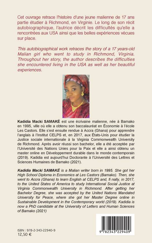 Cet ouvrage retrace l'histoire d'une jeune malienne de 17 ans partie étudier à Richmond, en Virginie. Le long de son récit autobiographique, l'autrice décrit les difficultés qu'elle a rencontrées aux USA ainsi que les belles expériences vécues sur place.