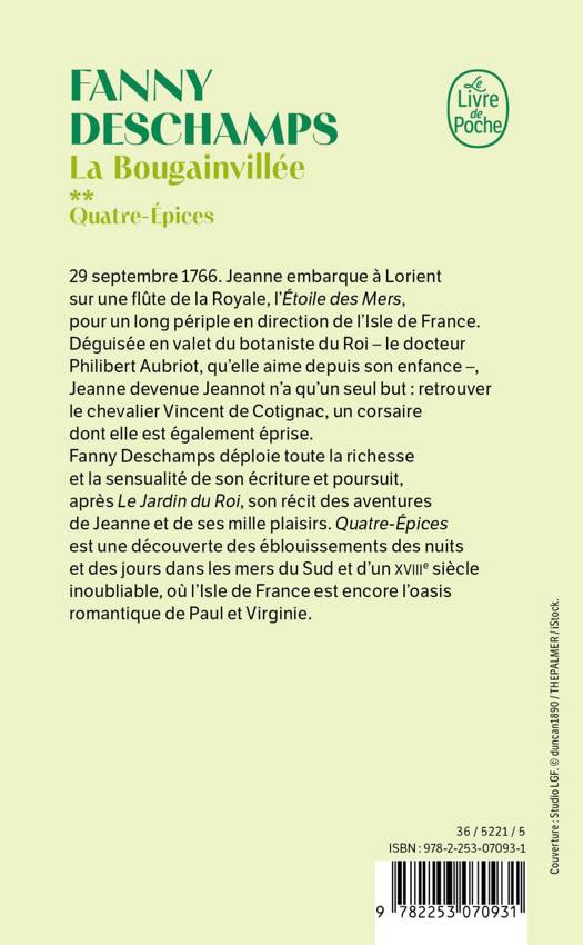 Fanny Deschamps déploie toute la richesse et la sensualité de son écriture et poursuit, après Le Jardin du Roi, son récit des aventures de Jeanne, que l’on entend rire et pleurer de ses mille plaisirs et de ses amours. Quatre-Épices est une découverte des éblouissements des nuits et des jours dans les mers du Sud, au temps où l’Isle de France est encore l’oasis romantique de Paul et Virginie, et participe à la recréation d’un xviiie siècle inoubliable.