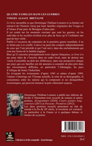Ce livre retrace l'histoire vécue par les familles de l'auteur et de son épouse, originaires des Vosges et d'Alsace d'une part, de Bretagne d'autre part. Il est centré sur les moments cruciaux que sont les guerres : il donne une vision d'ensemble de plusieurs conflits, dans une perspective élargie aux pays que ces familles ont connus dans des circonstances difficiles, en particulier l'Allemagne, les pays d'Afrique du Nord, l'Indochine.