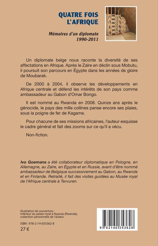 Un diplomate belge nous raconte la diversité de ses affectations en Afrique. Après le Zaïre en déclin sous Mobutu, il poursuit son parcours en Égypte dans les années de gloire de Moubarak. De 2000 à 2004, il observe les développements en Afrique centrale et défend les intérêts de son pays comme ambassadeur au Gabon d'Omar Bongo. Il est nommé au Rwanda en 2008. Quinze ans après le génocide, le pays des mille collines panse encore ses plaies, sous la poigne de fer de Kagame. Pour chacune de ses missions africaines, l'auteur esquisse le cadre général et fait des zooms sur ce qu'il a vécu. Non-fiction.