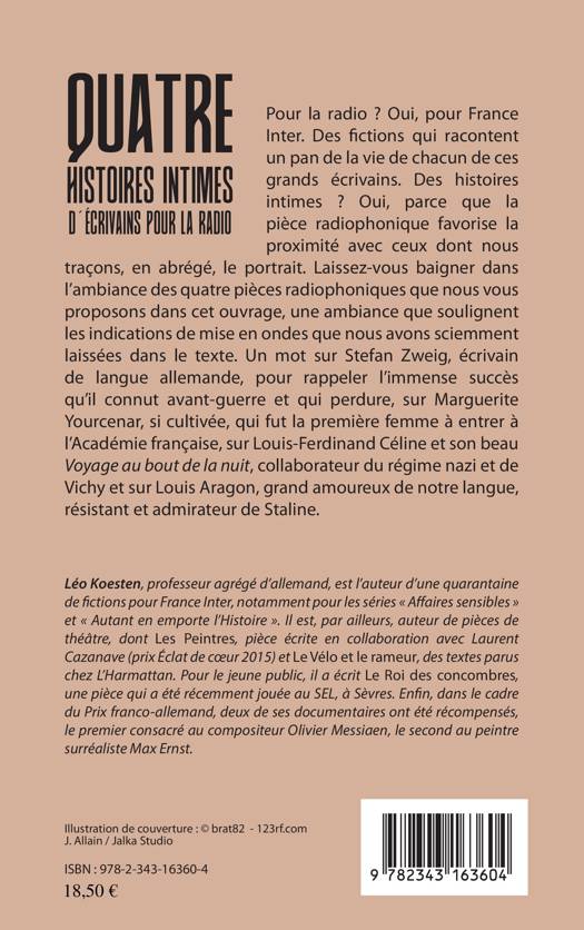 Laissez-vous baigner dans l'ambiance de quatre pièces radiophoniques aux récits intimes de quatre immenses écrivains : Stefan Zweig, écrivain de langue allemande, avec le succès fulgurant qu'il connut avant-guerre et qui perdure ; Marguerite Yourcenar, si cultivée, qui fut la première femme à entrer à l'Académie française ; Louis-Ferdinand Céline et son beau Voyage au bout de la nuit, collaborateur du régime nazi et de Vichy ; et Louis Aragon, grand amoureux de notre langue, résistant et admirateur de Staline.