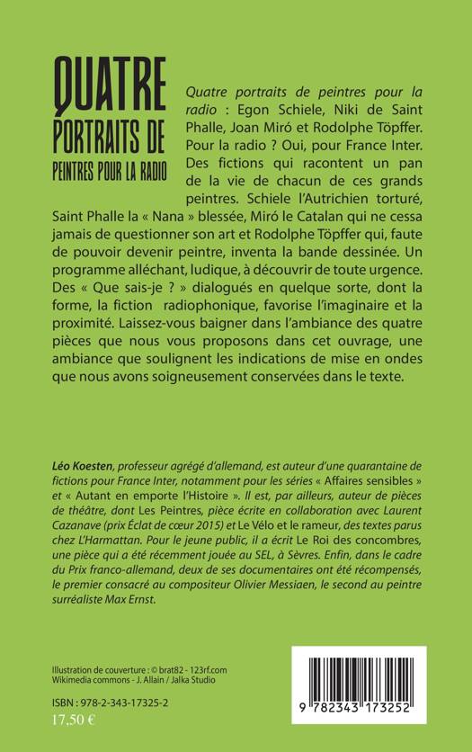 Pour la radio ? Oui, pour France Inter. Des fictions qui racontent un pan de la vie de chacun de ces grands peintres. Schiele l'Autrichien torturé, Saint Phalle la « Nana » blessée, Miro le Catalan qui ne cessa jamais de questionner son art et Rodolphe Töpffer qui, faute de pouvoir devenir peintre, inventa la bande dessinée. Un programme alléchant, ludique, à découvrir de toute urgence.