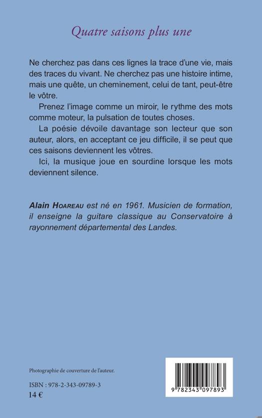 Ne cherchez pas dans ces lignes traces d'une vie, mais des traces du vivant. Ne cherchez pas une histoire intime, mais une quête, un cheminement, celui de tant, peut-être le vôtre. Prenez l'image comme un miroir, le mythe des mots comme moteur, la pulsation de toutes choses. La poésie dévoile davantage son lecteur que son auteur, alors, en acceptant ce jeu difficile, il se peut que ces saisons deviennent les vôtres. Ici, la musique joue en sourdine lorsque les mots deviennent silence.
