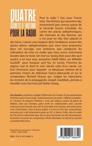 Ils s'appellent Georg Elser, Wilhelm Gustloff, Kurt Hinzmann ou Richard Strauss. Ils ont vécu la Seconde guerre mondiale et ont marqué, chacun à sa manière, l'Histoire du XXe siècle. Découvrez, au travers de ces quatre pièces radiophoniques ici retranscrites, les événements petits et grands qui ont participé à faire de ces hommes des héros ou des salauds.