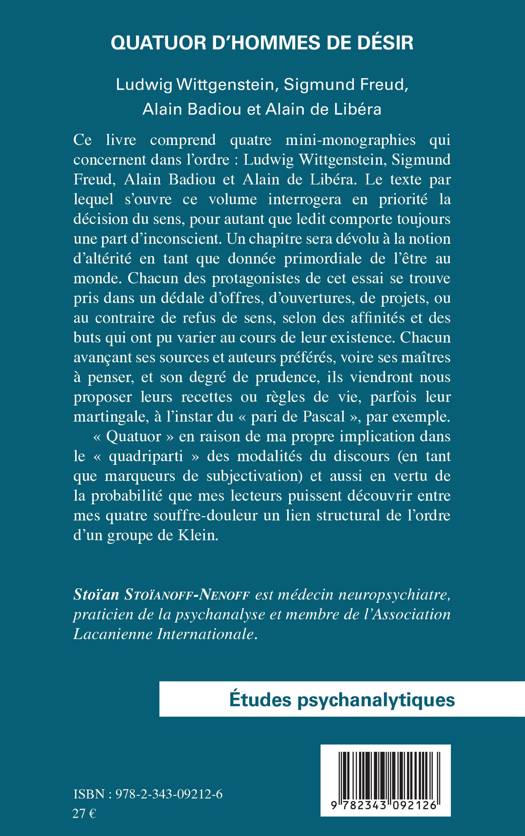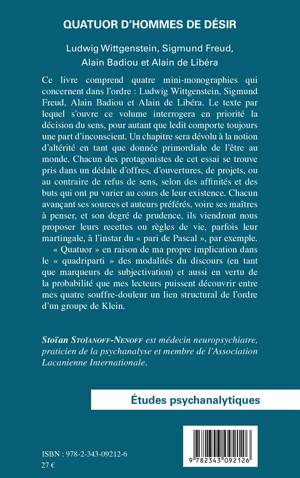 Ce livre comprend quatre mini-monographies qui concernent dans l'ordre : Ludwig Wittgenstein, Sigmund Freud, Alain Badiou et Alain de Libéra. « Quatuor » en raison de la propre implication de l'auteur dans le « quadriparti » des modalités du discours (en tant que marqueurs de subjectivation) et aussi en vertu de la probabilité que ses lecteurs puissent découvrir entre ses quatre souffre-douleur un lien structural de l'ordre d'un groupe de Klein.