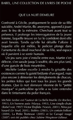 QUE LA NUIT DEMEURE Confronté à Cécile, pratiquement le sosie de sa fille suicidée, André Martin, flic anonyme, apprend à jouer avec le feu de la mémoire. Cherchant avant tout sa présence, il prolonge les interrogatoires de la jeune femme, laquelle trouve en lui le confident dont elle avait besoin. Tandis qu'elle lui détaille l'affaire à laquelle elle est mêlée, le policier plonge dans l'amertume du deuil inachevé de sa fille, seul espace où il parvient à se sentir humain. Un jeu sans joie s'installe entre eux. Martin s'en délecte, s'en saoule jusqu'à souffrir, dix ans plus tard, d'une gueule de bois meurtrière. Michèle Lesbre excelle à rendre la grisaille des existences comme la gaieté brûlante d'un regard, mais plus encore à démonter les dérèglements de chacun, les petites folies qui font tous les jours les grands drames. Que la nuit demeure résonne de la "petite musique" si particulière qu'elle a su faire entendre dans le tintamarre du polar français. Michèle Lesbre est l'auteur de La Belle Inutile (Le Rocher, 1991), Un homme assis (Manya, 1993), Une simple chute (Babel noir, 1997) Victor Dojlida (Noesis, 2001), Nina par hasard (Le Seuil, 2001). Boléro (2003), Un certain Felloni (2004), La Petite Trotteuse (2005) et Le Canapé rouge (2007) ont été publiés chez Sabine Wespieser Editeur. mais dont le cercle des voyages se resserre -, de la séparation, de sa route à lui, nouvelle, avec les livres...