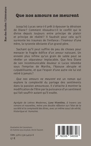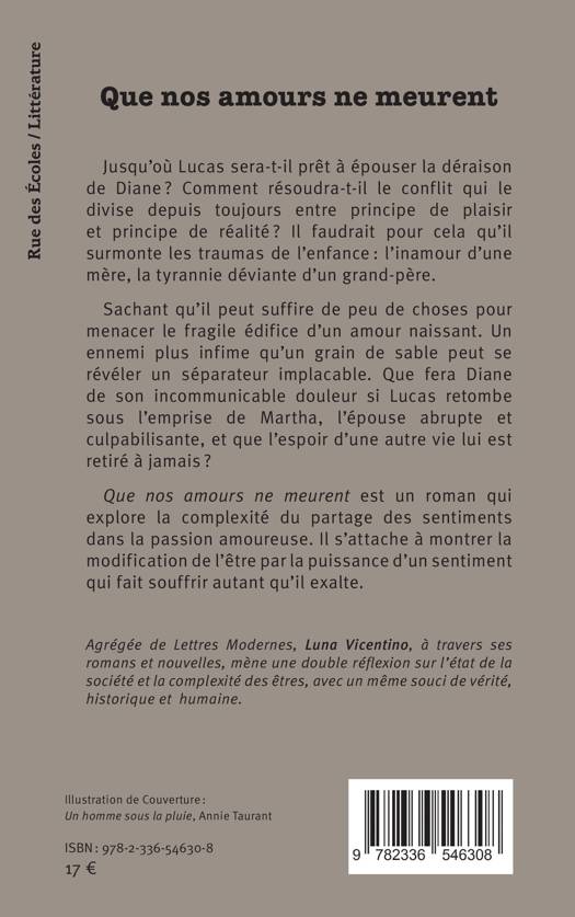Que nos amours ne meurent est un roman qui explore la complexité du partage des sentiments dans la passion amoureuse. Il s’attache à montrer la  modification de l’être par la puissance d’un sentiment qui fait souffrir autant qu’il exalte.