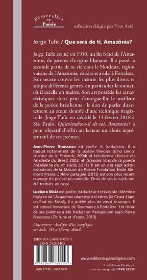 Jorge Tufic est né en 1930, au fin fond de l’Amazonie, de parents d’origine libanaise. Il a passé la seconde partie de sa vie dans le Nordeste, région voisine de l’Amazonie, côtière et aride, à Fortaleza. Son oeuvre couvre les thèmes les plus divers et adopte différents genres, en particulier le sonnet, où il excelle en maître. Son art possède les caractéristiques dont peut s’enorgueillir le meilleur de la poésie brésilienne : le don de parler directement au cœur, doublé d’une technique magistrale. Jorge Tufic est décédé le 14 février 2018 à São Paulo. Qu’adviendra-t-il de toi, Amazonie ? a pour objectif d’offrir au lecteur un choix représentatif de ses poèmes. Jean-Pierre Rousseau est poète et traducteur. Il a traduit notamment de la poésie finnoise (Eino Leino, chantre de la Finlande, 2004) et brésilienne (Poésie du Nordeste du Brésil, 2002, et Grandes Voix de la poésie brésilienne du xxe siècle, 2011). Il est un des sept administrateurs de la Maison de Poésie Fondation Émile Blémont (Paris). L’Âme partagée (2015) est son plus récent ouvrage de poésie personnelle. Deux de ses recueils ont été traduits en russe. Luciano Maia est poète, traducteur et essayiste. Membre titulaire de l’Académie céarense de lettres (le Ceará étant un État du Brésil), il a publié plus de vingt ouvrages. Il est consul honoraire de Roumanie à Fortaleza. Un choix de ses poèmes a été traduit en français par Jean-Pierre Rousseau (De lune et d’eaux, 2013).