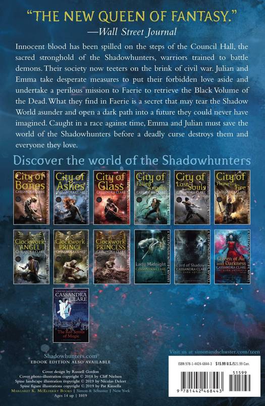 Dark secrets and forbidden love threaten the very survival of the Shadowhunters in Cassandra Clare's Queen of Air and Darkness, the final novel in the New York Times and USA TODAY bestselling The Dark Artifices trilogy. Queen of Air and Darkness is a Shadowhunters novel. What if damnation is the price of true love? Innocent blood has been spilled on the steps of the Council Hall, the sacred stronghold of the Shadowhunters. Their society now teeters on the brink of civil war. One fragment of the Blackthorn family flees to Los Angeles, seeking to discover the source of the disease that is destroying the race of warlocks. Meanwhile, Julian and Emma take desperate measures to put their forbidden love aside and undertake a perilous mission to Faerie to retrieve the Black Volume of the Dead. What they find there is a secret that may tear the Shadow World asunder and open a dark path into a future they could never have imagined. Caught in a race against time, Emma and Julian must save the world of the Shadowhunters before a deadly curse destroys them and everyone they love.