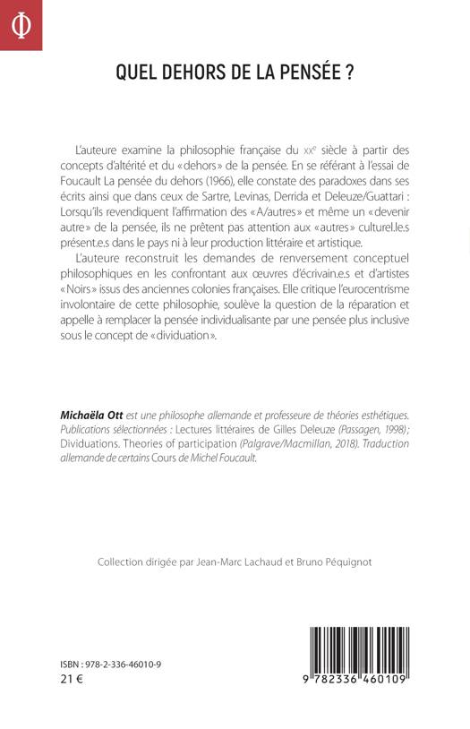 L'auteure examine la philosophie française du XXe siècle à partir des concepts d'altérité et du dehors de la pensée. En se référant à l'essai de Foucault La pensée du dehors (1966), elle constate des paradoxes dans ses écrits ainsi que dans ceux de Sartre, Levinas, Derrida et Deleuze/Guattari lorsqu'ils revendiquent l'affirmation des A/autres et même un devenir autre de la pensée, ils ne prêtent pas attention aux autres culturel.le.s présent.e.s dans le pays ni à leur production littéraire et artistique. L'auteure reconstruit les demandes de renversement conceptuel philosophiques en les confrontant aux oeuvres d'écrivain.e.s et d'artistes Noirs issus des anciennes colonies françaises. Elle critique l'eurocentrisme involontaire de cette philosophie, soulève la question de la réparation et appelle à remplacer la pensée individualisante par une pensée plus inclusive sous le concept de dividuation .