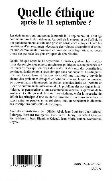 Les événements qui ont secoué le monde le 11 septembre 2001 ont agi comme une sorte de catalyseur. Au delà de la stupeur et de l'effroi, ces contributions posent la question de savoir : quelle éthique après le 11 septembre? Juristes, philosophes, spécialistes des religions et experts en sciences politiques réinterrogent les fondements des droits de l'homme, l'idée de communauté internationale, le problème des politiques impériales et les perspectives d'une assemblée universelle, la question de la violence et celle du mal, le statut des victimes, enfin la nécessité de définir les principes d'une solidarité universelle.