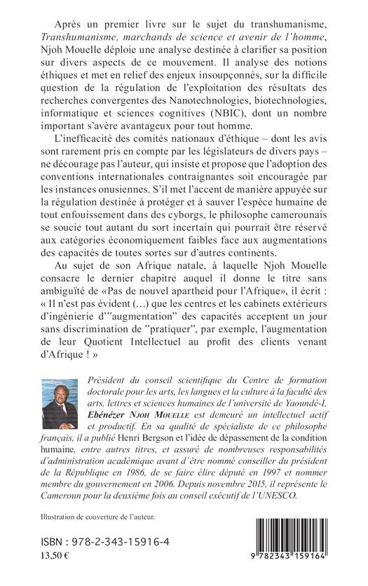 L'auteur déploie une analyse destinée à clarifier sa position sur divers aspects du transhumanisme. Il analyse des notions éthiques et met en relief des enjeux insoupçonnés, sur la difficile question de la régulation de l'exploitation des résultats des recherches convergentes des Nanotechnologies, biotechnologies, informatique et sciences cognitives. S'il met l'accent de manière appuyée sur la régulation destinée à protéger et à sauver l'espèce humaine de tout enfouissement dans des cyborgs, le philosophe camerounais se soucie tout autant du sort incertain qui pourrait être réservé aux catégories économiquement faibles face aux augmentations des capacités de toutes sortes sur d'autres continents.