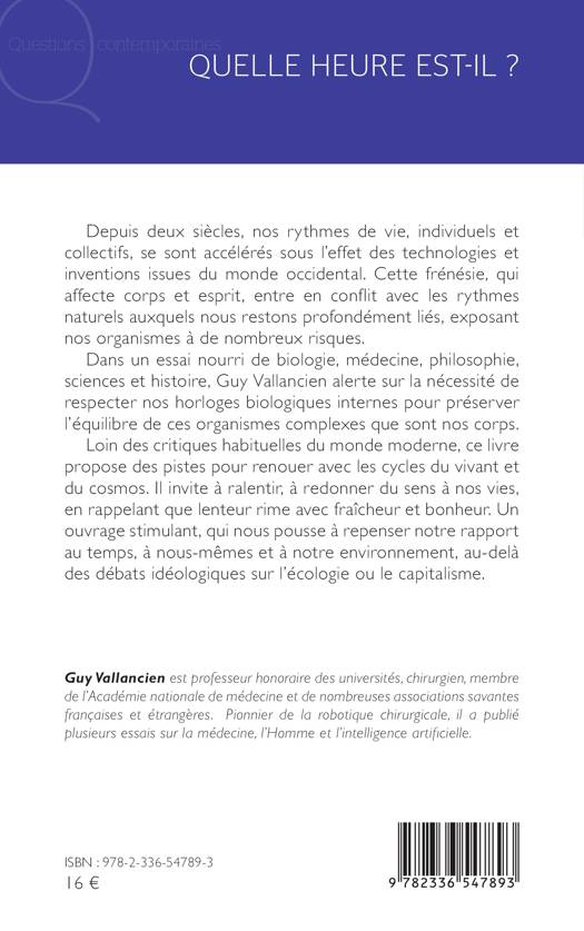 Dans un essai nourri de biologie, médecine, philosophie, sciences et histoire, Guy Vallancien alerte sur la nécessité de respecter nos horloges biologiques internes pour préserver l'équilibre de ces organismes complexes que sont nos corps.
