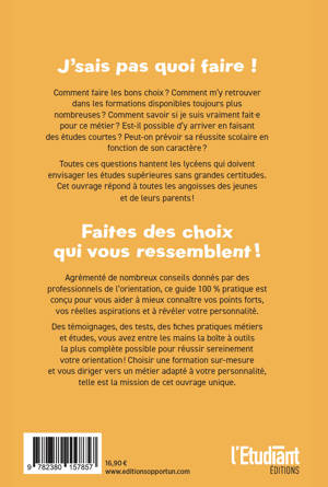 La bible pour accéder au job de ses rêves ! Comment m’y retrouver avec la multitude de formations disponibles ? Comment savoir quelles études mènent au métier de mes rêves ? Est-ce que le métier que je souhaite faire nécessite des études courtes ou longues ? Les enjeux de l’orientation sont parfois anxiogènes et ne pas réussir à s’y retrouver est fréquent. Ce guide 100 % pratique est fait pour vous et a été conçu comme un outil d’aide à la décision dans votre orientation pour vous aider en toute sérénité. Choisissez la formation la plus adaptée à vos envies et laissez-vous guider par les conseils de professionnels.
