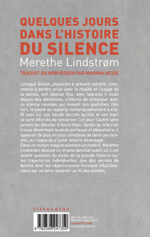 Lorsque Simon, physicien à présent retraité, commence à perdre prise avec la réalité et l'usage de la parole, son épouse Eva, avec laquelle il vivait depuis des décennies, s'efforce de composer avec ce silence nouveau qui investit son quotidien. Dès lors, le passé se rappelle immanquablement à elle. Et avec lui, ces lourds secrets qu'elle et son mari se sont efforcés de conserver l'un pour l'autre sans jamais les dévoiler à leurs filles. Tandis qu'elle s'en trouve désormais la seule porteuse et dépositaire, il apparaît de plus en plus complexe de taire ces non-dits, au risque de s'isoler encore davantage. Dans ce roman magistralement orchestré, Merethe Lindstrøm déploie un drame familial subtil où il est autant question du poids de la grande histoire sur les trajectoires individuelles, que des secrets de famille dont les répercussions finissent infailliblement par se faire ressentir au fil des années.