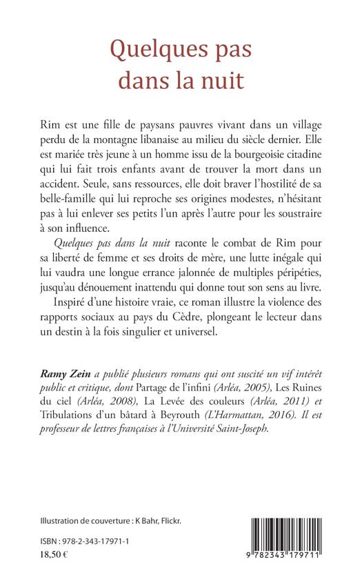 Rim est une fille de paysans pauvres vivant dans un village perdu de la montagne libanaise au milieu du siècle dernier. Elle est mariée très jeune à un homme issu de la bourgeoisie citadine qui lui fait trois enfants avant de trouver la mort dans un accident. Seule, sans ressources, elle doit braver l'hostilité de sa belle-famille qui lui reproche ses origines modestes, n'hésitant pas à lui enlever ses petits l'un après l'autre pour les soustraire à son influence. Quelques pas dans la nuit raconte le combat de Rim pour sa liberté de femme et ses droits de mère, une lutte inégale qui lui vaudra une longue errance jalonnée de multiples péripéties, jusqu'au dénouement inattendu qui donne tout son sens au livre. Inspiré d'une histoire vraie, ce roman illustre la violence des rapports sociaux au pays du Cèdre, plongeant le lecteur dans un destin à la fois singulier et universel.