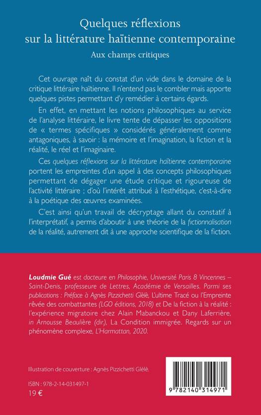 Cet ouvrage naît du constat d'un vide dans le domaine de la critique littéraire haïtienne. Il n'entend pas le combler mais apporte quelques pistes permettant d'y remédier à certains égards. En effet, en mettant les notions philosophiques au service de l'analyse littéraire, le livre tente de dépasser les oppositions de termes spécifiques considérés généralement comme antagoniques, à savoir: la mémoire et l'imagination, la fiction et la réalité, le réel et l'imaginaire. Ces quelques réflexions sur la littérature haïtienne contemporaine portent les empreintes d'un appel à des concepts philosophiques permettant de dégager une étude critique et rigoureuse de l'activité littéraire; d'où l'intérêt attribué à l'esthétique, c'est-à-dire à la poétique des oeuvres examinées. C'est ainsi qu'un travail de décryptage allant du constatif à l'interprétatif, a permis d'aboutir à une théorie de la fictionnalisation de la réalité, autrement dit à une approche scientifique de la fiction.