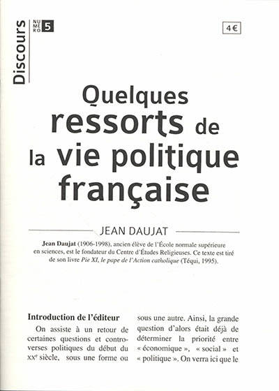 « Discours » est la nouvelle collection de Pierre Téqui éditeur. Cette collection comprend des textes courts et percutants pour aller directement à l'essentiel des enjeux de notre époque. Des textes d'opinion, d'histoire, de doctrine, de philosophie, de vie.. Dans ce numéro 5, retour à la politique : en quoi certains combats du début du XXe siècle permettent-ils de mieux comprendre la vie politique française d'aujourd'hui, en vue des prochaines échéances électorales ? Pour éviter les errements. À propos de Jean Daujat : Jean Daujat (1906-1998), ancien élève de l'École normale supérieure en sciences, est le fondateur du Centre d'Études Religieuses. Ce texte est tiré de son livre Pie XI, le pape de l'Action catholique (Téqui,1995).