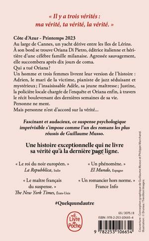 Au large de Cannes, un yacht dérive entre les îles de Lérins. À son bord se trouve Oriana Di Pietro, éditrice italienne et héritière d’une célèbre famille milanaise. Agressée sauvagement, elle succombera après dix jours de coma. Qui a tué Oriana ? Un homme et trois femmes livrent leur version de l’histoire : Adrien, le mari de la victime, pianiste de jazz séduisant et mystérieux ; l’insaisissable Adèle, sa jeune maîtresse ; Justine, la policière locale chargée de l’enquête et Oriana enfin, à travers le récit bouleversant des dernières semaines de sa vie. Personne ne ment. Mais personne n’est d’accord sur la vérité...