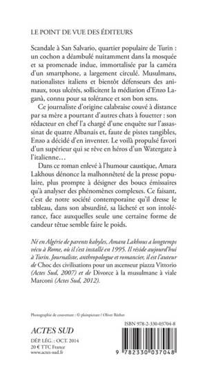 Scandale à San Salvario, quartier populaire de Turin : un cochon a déambulé nuitamment dans la mosquée et sa promenade indue, immortalisée par la caméra d'un smartphone, a largement circulé. Musulmans, nationalistes italiens et bientôt défenseurs des animaux, tous ulcérés, sollicitent la médiation d'Enzo Laganà, connu pour sa tolérance et son bon sens.