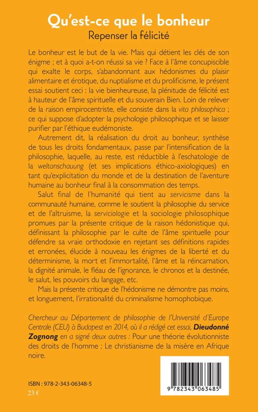 Le bonheur est le but de la vie. Mais qui détient les clés de son énigme et en quoi a-t-on réussi sa vie ? Face à l'âme concupiscible qui exalte le corps, s'abandonnant aux hédonismes du plaisir alimentaire et érotique, du nuptialisme et du profilicisme, cette critique de la raison hédonistique élucide les énigmes de la liberté, du déterminisme, la mort et l'immortalité, le fléau de l'ignorance, le chronos, la destinée, les pouvoirs du langage... Elle démontre longuement l'irrationalité du criminalisme homophobique.