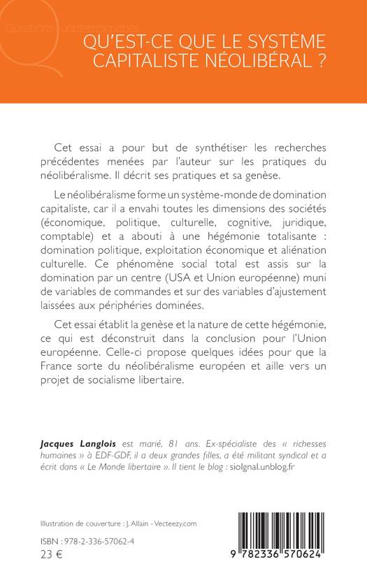 Cet essai a pour but de synthétiser les recherches précédentes menées par l'auteur sur les pratiques du néolibéralisme. Il décrit ses pratiques et sa genèse. Le néolibéralisme forme un système-monde de domination capitaliste, car il a envahi toutes les dimensions des sociétés (économique, politique, culturelle, cognitive, juridique, comptable) et a abouti à une hégémonie totalisante: domination politique, exploitation économique et aliénation culturelle. Ce phénomène social total est assis sur la domination par un centre (USA et Union européenne) muni de variables de commandes et sur des variables d'ajustement laissées aux périphéries dominées. Cet essai établit la genèse et la nature de cette hégémonie, ce qui est déconstruit dans la conclusion pour l'Union européenne. Celle-ci propose quelques idées pour que la France sorte du néolibéralisme européen et aille vers un projet de socialisme libertaire.