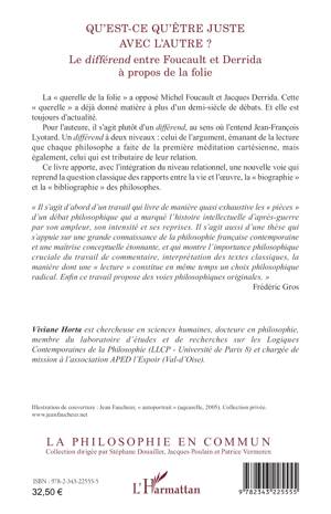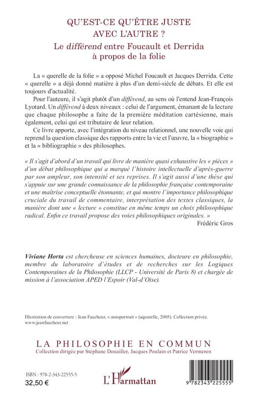La querelle de la folie a opposé Michel Foucault et Jacques Derrida. Cette querelle a déjà donné matière à plus d'un demi-siècle de débats. Et elle est toujours d'actualité. Pour l'auteure, il s'agit plutôt d'un différend, au sens où l'entend Jean-François Lyotard. Un différend à deux niveaux: celui de l'argument, émanant de la lecture que chaque philosophe a faite de la première méditation cartésienne, mais également, celui qui est tributaire de leur relation. Cet ouvrage apporte, avec l'intégration du niveau relationnel, une nouvelle voie qui reprend la question classique des rapports entre la vie et l'oeuvre, la biographie et la bibliographie des philosophes.